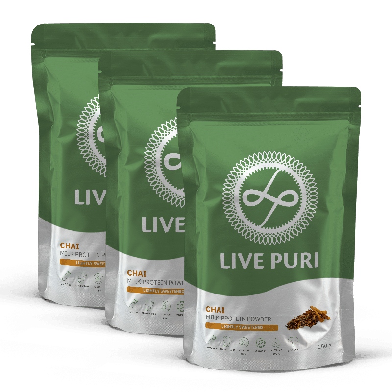 Ons chai eiwitpoeder is licht gezoet en gemaakt van hoogwaardige wei- en caseïnaat-eiwitten uit verse melk. Geen kaaswei of goedkope vulmiddelen, maar pure kwaliteit. Dankzij de combinatie van snelle en langzame eiwitopname geef je jouw spieren wat ze nodig hebben, én blijf je langer verzadigd. Ideaal na het sporten of als voedzaam tussendoortje. Wil je meer weten? Je lees hier waarom Live Puri eiwitpoeder zo uniek is!