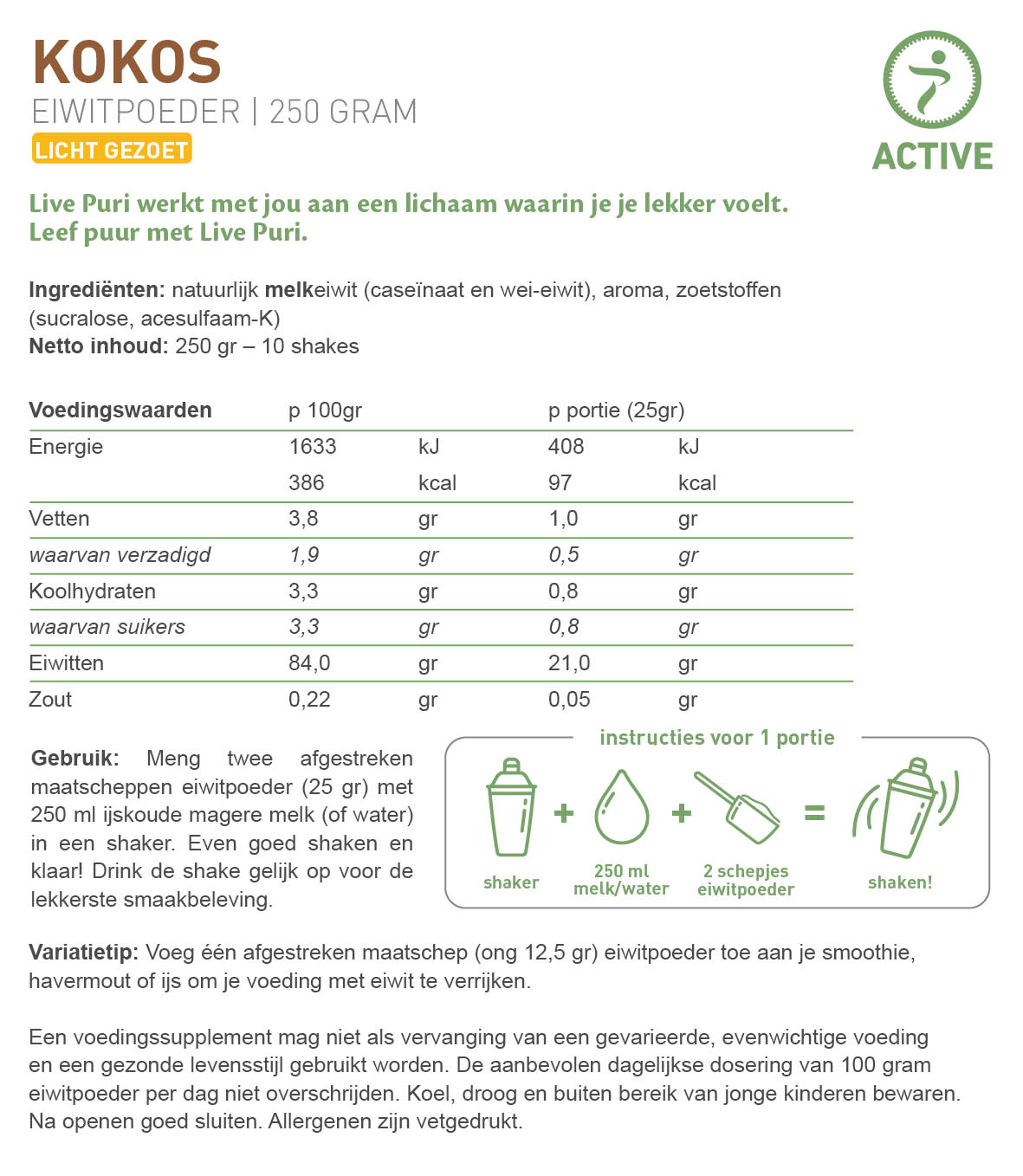 Het Live Puri kokos eiwitpoeder is gemaakt van een zorgvuldig afgestemde mix van wei-eiwit en caseïnaat uit verse melk – en dus niet uit reststromen van kaasproductie. Deze combinatie biedt zowel snelle opname als langdurige eiwitafgifte. Zo krijgt je lichaam direct én langdurig de eiwitten die het nodig heeft voor spierherstel en verzadiging. Ideaal voor sporters én voor wie op een verantwoorde manier zijn of haar eiwitinname wil verhogen.