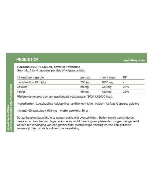 Voor een optimale werking zijn onze probiotica met calcium en fosfor verrijkt. En zo is een goede werking van onze Live Puri probiotica capsules gegarandeerd! Omdat onze probiotica levende goedaardige bacteriën bevat, bewaar je ze best in de koelkast. We verpakken ze in een donkerbruin glazen potje voor de allerbeste bescherming tegen licht. Transport buiten de koeling kan prima, maar bewaren doe je best in een gekoelde omgeving.