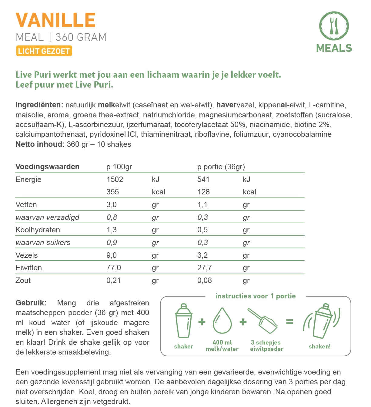 Live Puri vanille maaltijdvervanger – voedzaam, vullend en zonder toegevoegde suikers. Ervaar de kracht van balans met een shake die je energie én gemak geeft.