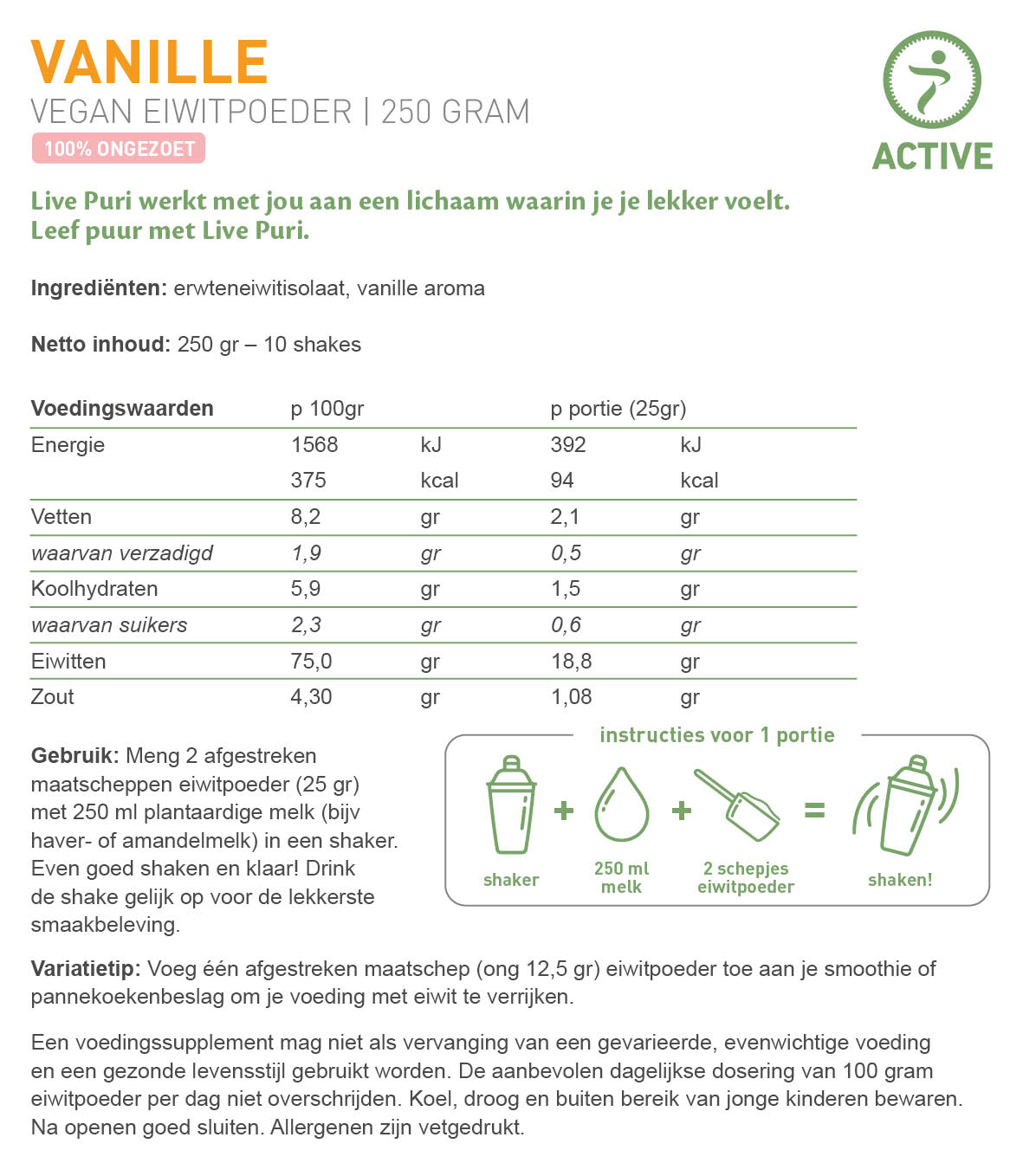 Voor een shake: Meng twee afgestreken maatschepjes (25 gram) met 250 ml plantaardige melk (bijv havermelk) in een shaker. Even goed shaken en klaar! Ook lekker in de blender, samen met vers fruit. Schenk je shake of smoothie in een ijskoud glas.