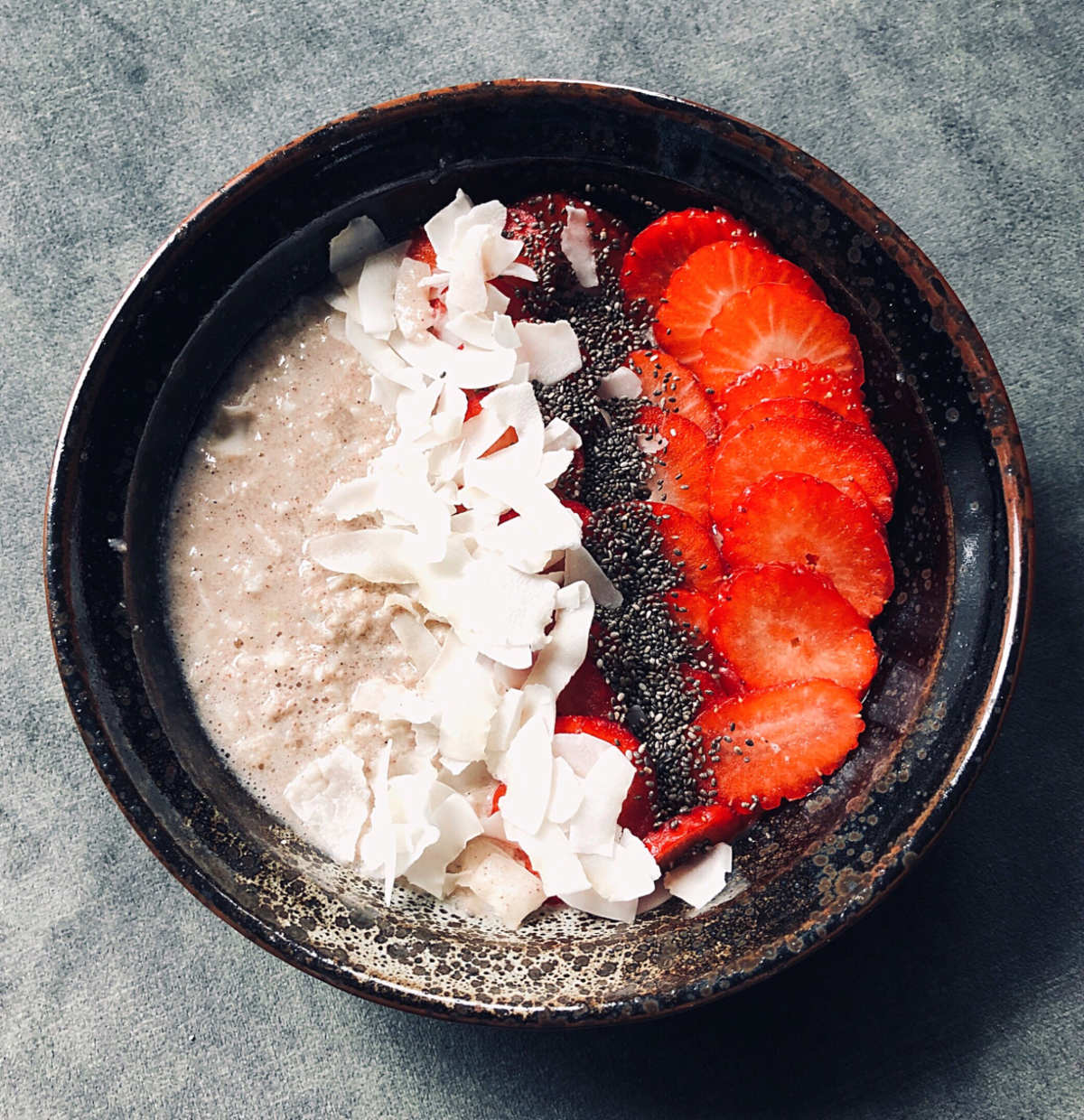 - Voeg toppings naar keuze toe (tip: vers fruit, kokosflakes en zaden zijn heerlijk in deze bowl!).