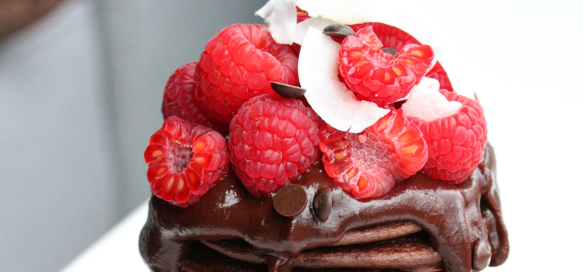 1. De choco-dadelsaus maak je door de ingrediënten hiervoor samen in een blender te doen en te mengen tot het een glad geheel is. Verwarm het op laag vuur in een pannetje zodat het wat indikt en verdeel de warme saus over de pancakes.