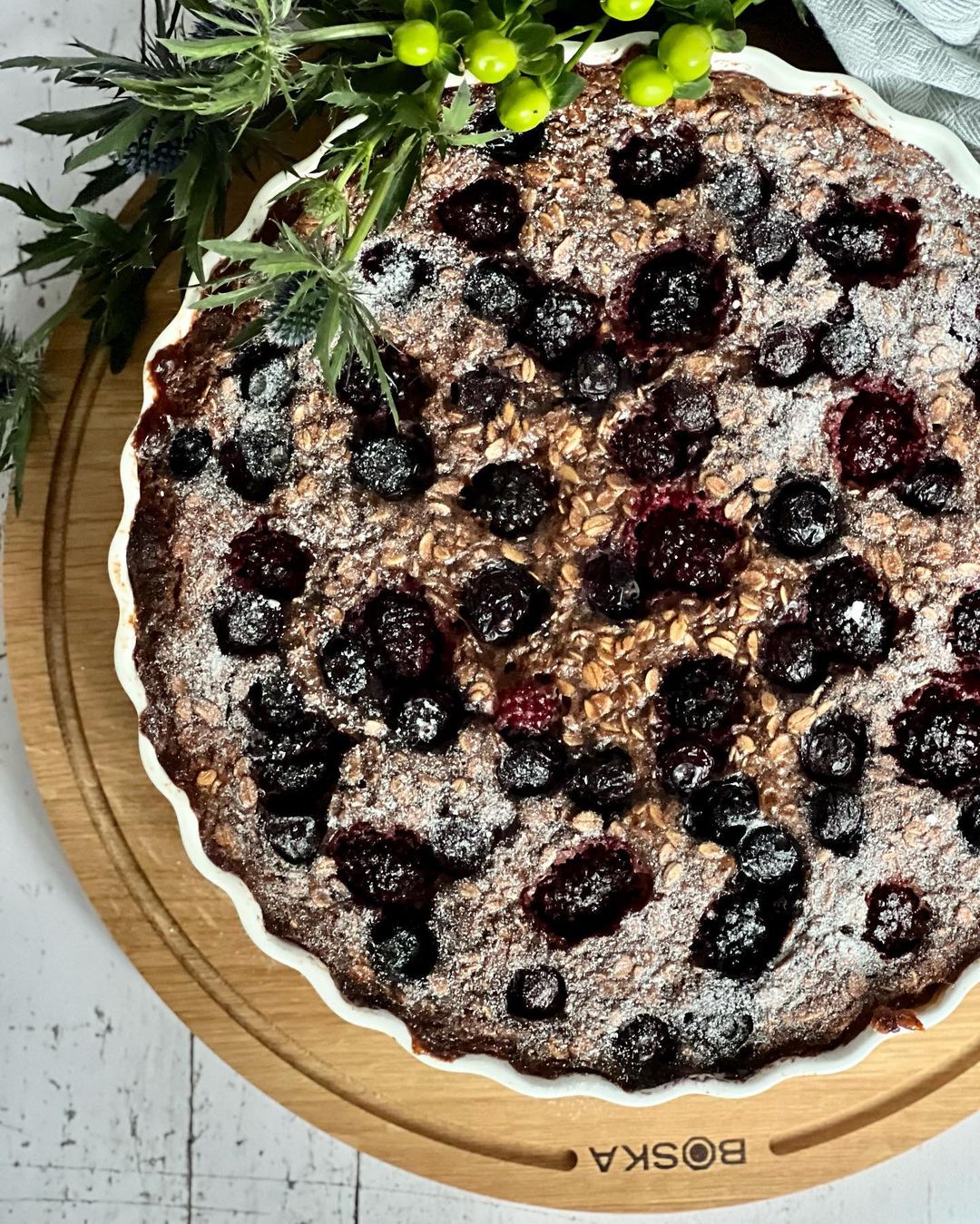 5. Giet het mengsel in de ovenschaal en verdeel het fruit over de bovenkant.