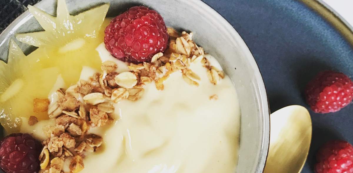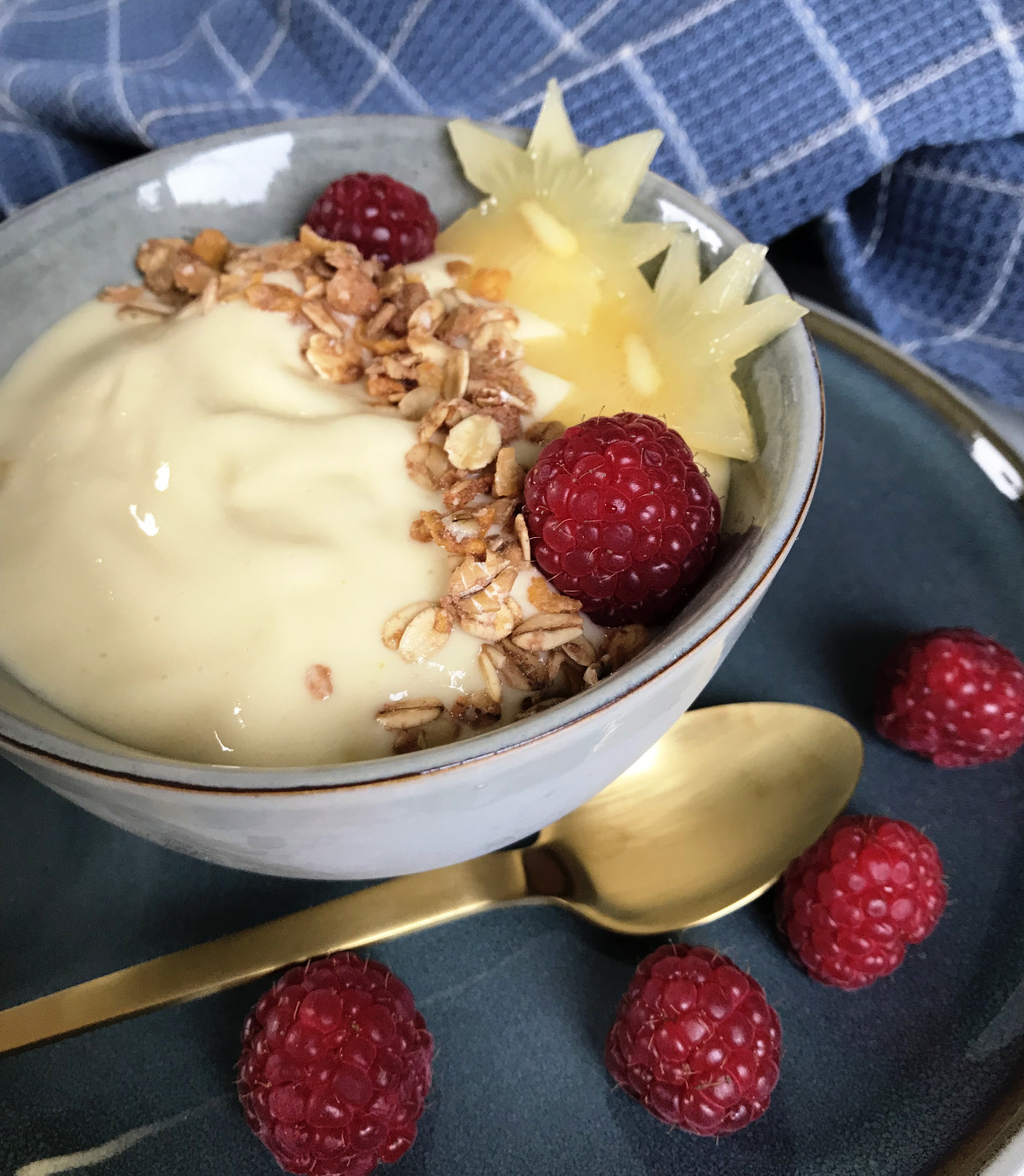 3. Schenk in je favoriete kom! Garneer met een beetje fruit voor een lekkere bite. Wij kozen kiwi en framboos. En strooiden er nog wat ongezoete noten granola overheen.