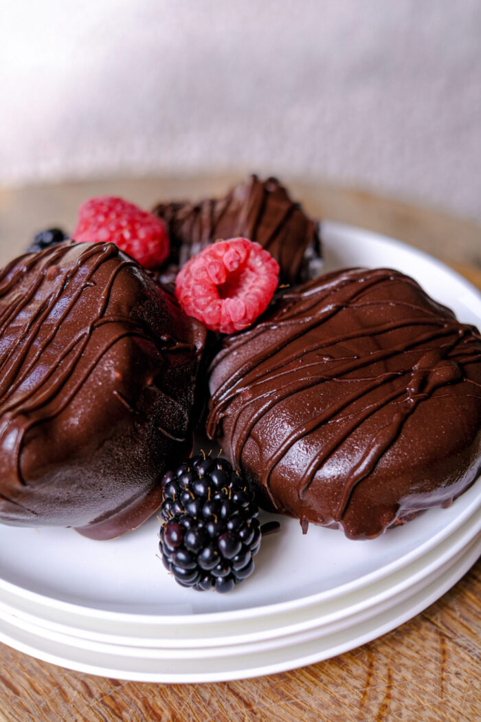 - Tip: Met de overgebleven chocolade kun je een mooie drizzle maken. Doe de gesmolten chocolade in een plastic zakje, knip een klein puntje af en gebruik het als spuitzak!