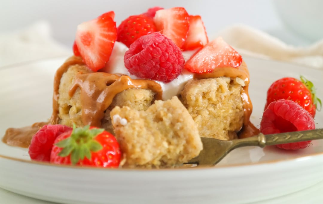 Begin de dag met een dansje, begin de dag met een lach. (En met deze gezonde banaan kokos mugcake met bijna 25 gram eiwitten!)