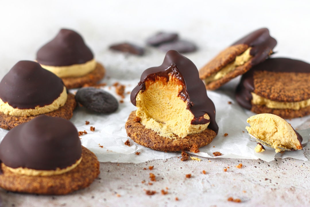 - Haal de koekjes uit de vriezer en dip ze 1 voor 1 in de chocolade. Even laten hard worden en smullen maar!