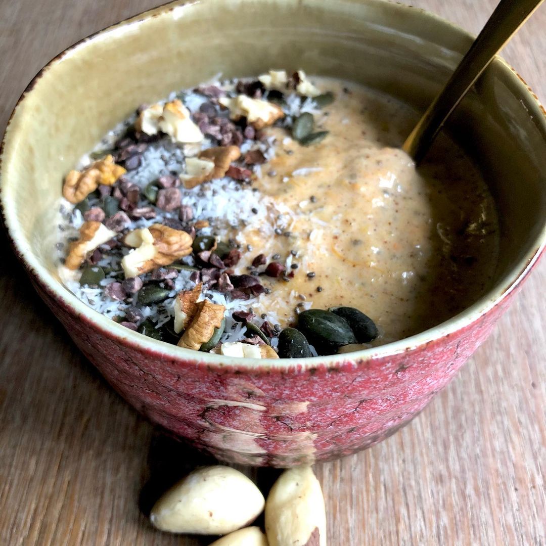 Ons eiwitpoeder in de smaak chai combineert erg lekker bij de andere ingrediënten van deze pap, maar eigenlijk kun je alle andere Live Puri smaken gebruiken. En ook afwerken kan geheel naar smaak. Hedwig koos voor kokos, walnoten, cacao nibs en pompoenpitten. Wat zou jouw favoriete topping zijn? Meer inspiratie? Kijk dan bij onze andere eiwitrijke ontbijt recepten! Smullen!