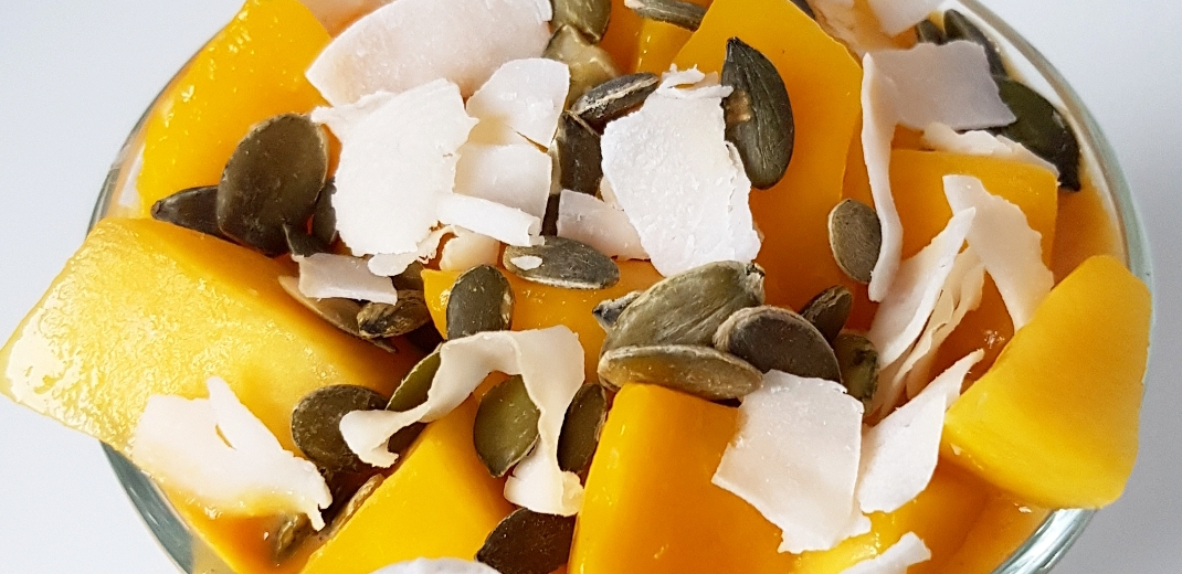 - Vul een kommetje met een paar lepels kwark en een laagje pompoenpap. Decoreer met de mango stukjes, pompoenpitten en kokossnippers.