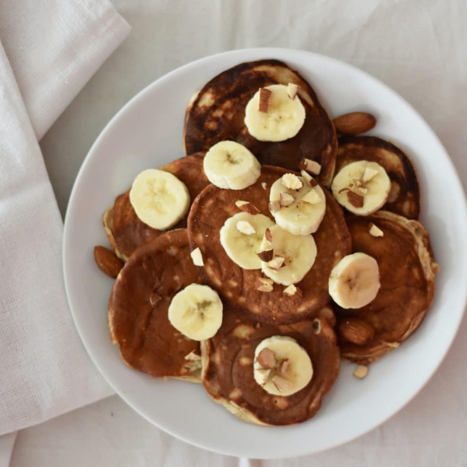 - Serveer de pannenkoeken met schijfjes banaan en gehakte amandelen.