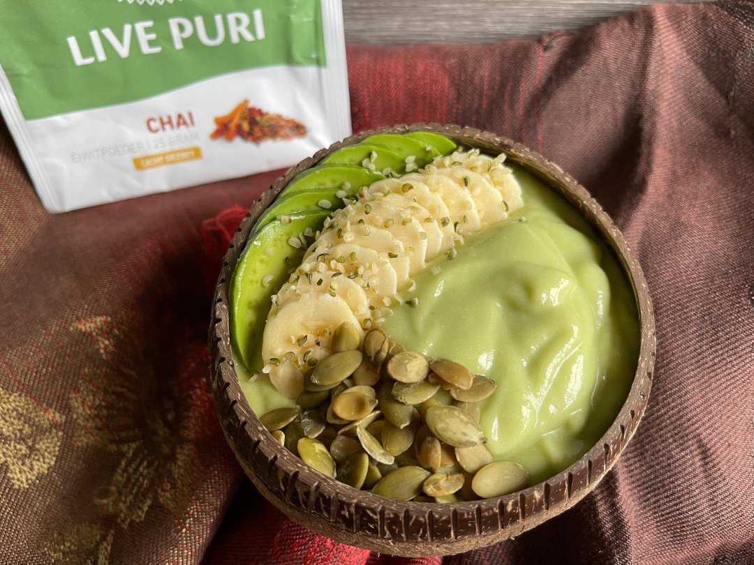 Mag ik je voorstellen aan deze super romige chai smoothiebowl? Hedwig verraste ons met dit recept dat vol zit met voedzame ingrediënten, zoals avocado en banaan. Juist deze fruitsoorten combineren heel goed met de kruidige smaak van Live Puri eiwitpoeder met Chai smaak. En is het geen schilderijtje?