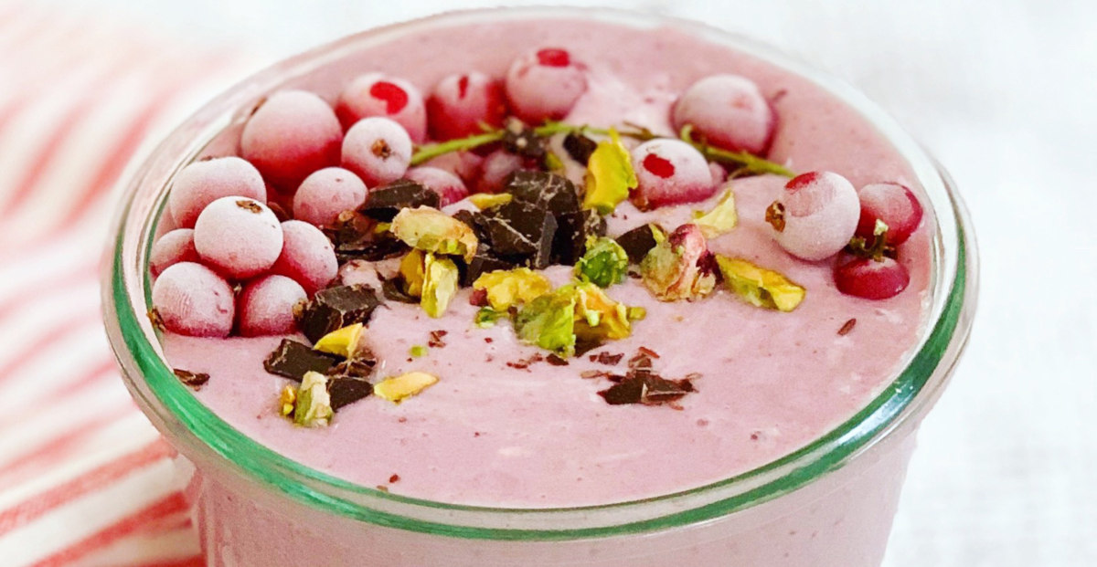 - Voor de topping nam ik een takje rode bessen en hakte ik 1 blokje extra pure chocolade en 4 pistachenootjes fijn.