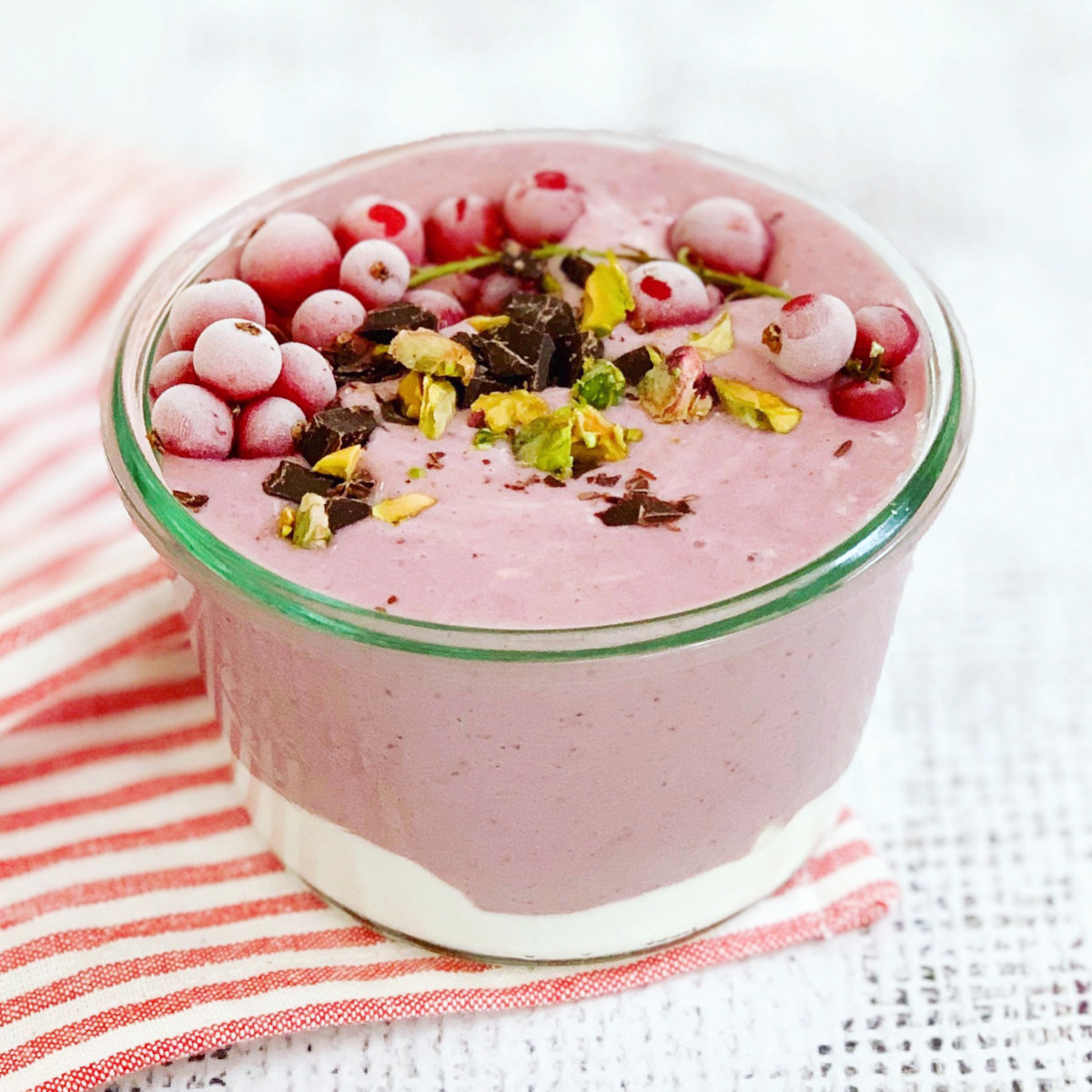 - Schep 100g magere kwark in een bakje en giet de smoothie er bovenop.