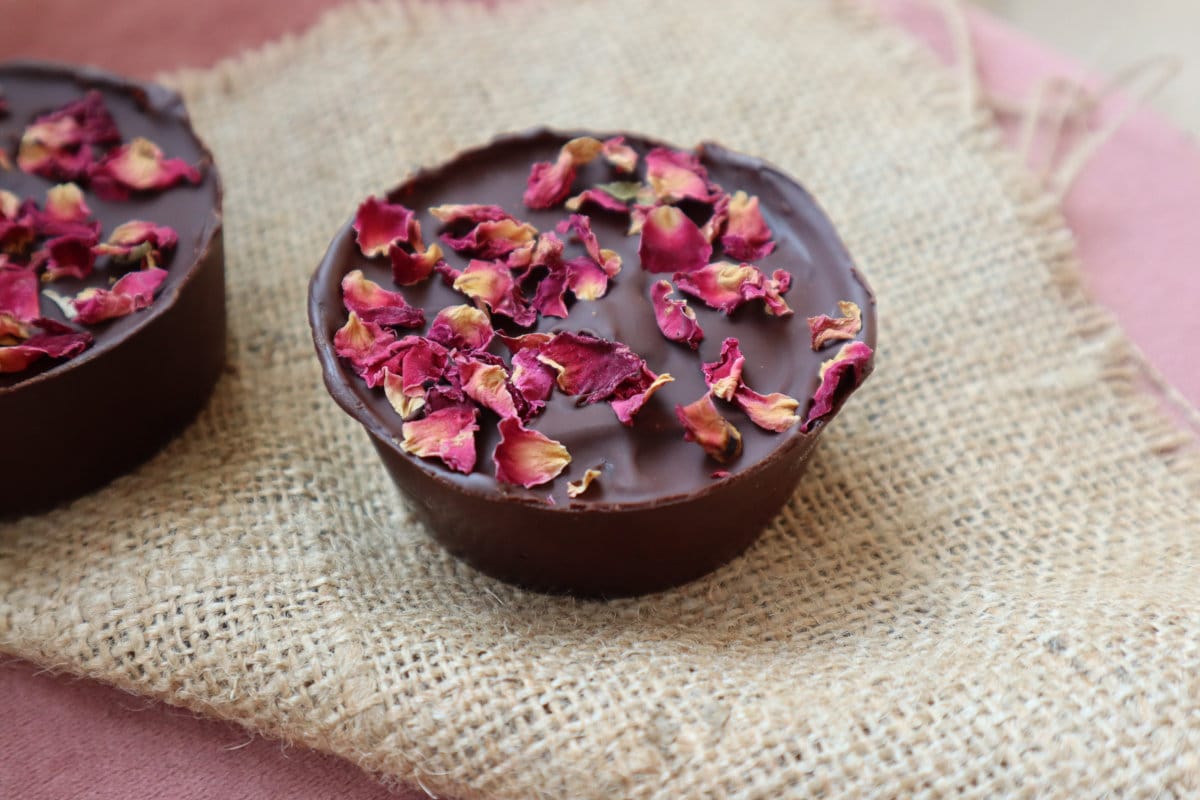 - Bedek de cups met de rest van de gesmolten chocolade, bestrooi met rozenblaadjes en zet in de koelkast tot ze stevig genoeg zijn.